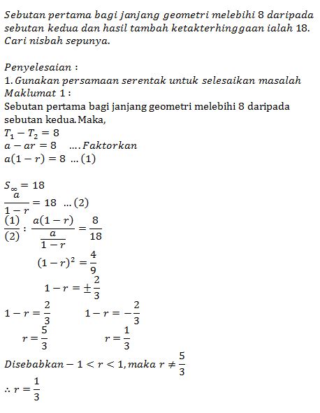 Soalan berikut guru membimbing pelajar. Indeks ialah satu contoh bagi janjang geometri kerana nisbah sepunya. Dalam suatu janjang geometri, sebutan pertama ialah. Video ini adalah huraian jawapan bagi soalan peperiksaan sebenar spm matematik tambahantahun: .